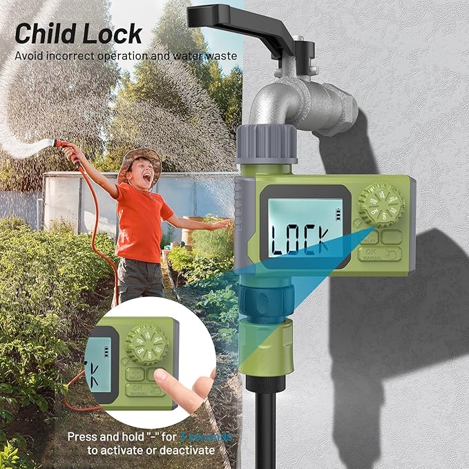 - 【Weatherproof, Child‑Safe Build】 This irrigation timer features an ABS housing that's waterproof, UV-resistant, and drop-resistant. The water sprinkler timer's IP54 waterproof battery cover is equipped with a rubber ring to isolate moisture. A child-proof lock ensures the water timer is safe and secure during children's activities,preventing water waste.
