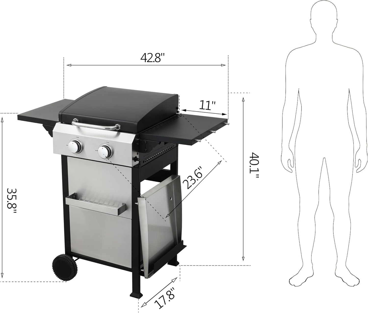 2-Burner Propane Gas BBQ Grill with SS Plancha, 24,600 BTU Output, Wire Enamel Cooking Grids, Foldable Side Table and Hanging Basket, Compact Stainless Steel Grill