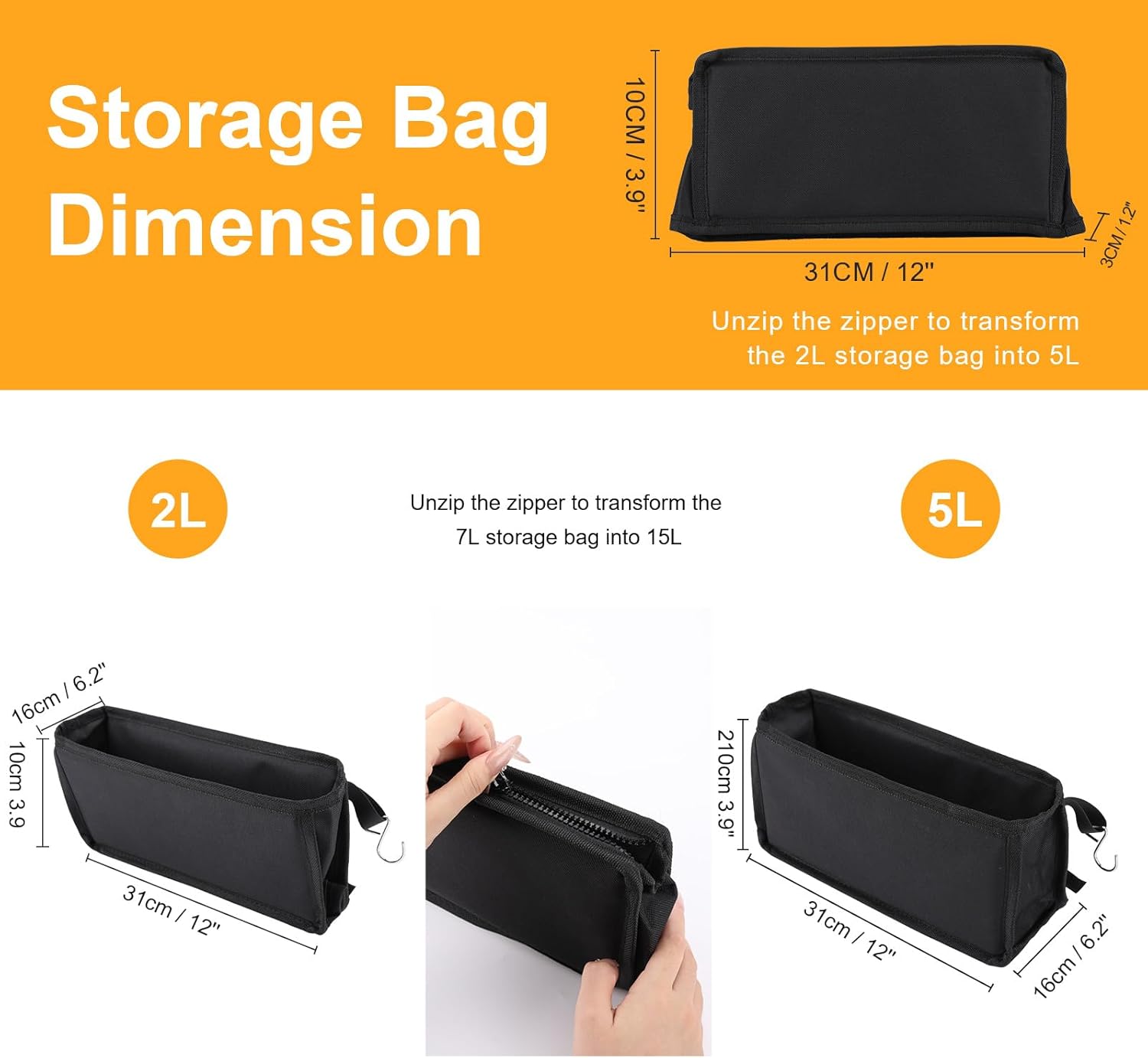 - 1×2/5L Transformable Storage Bag - 600D Oxford cloth made storage bag with PE waterproof coating on the inside. Each storage bag has 2 sturdy hooks, a smooth zipper, 2 tighten bands. Hang the cloth bag next to the table board with a hook and secure it to the table legs with a tight band