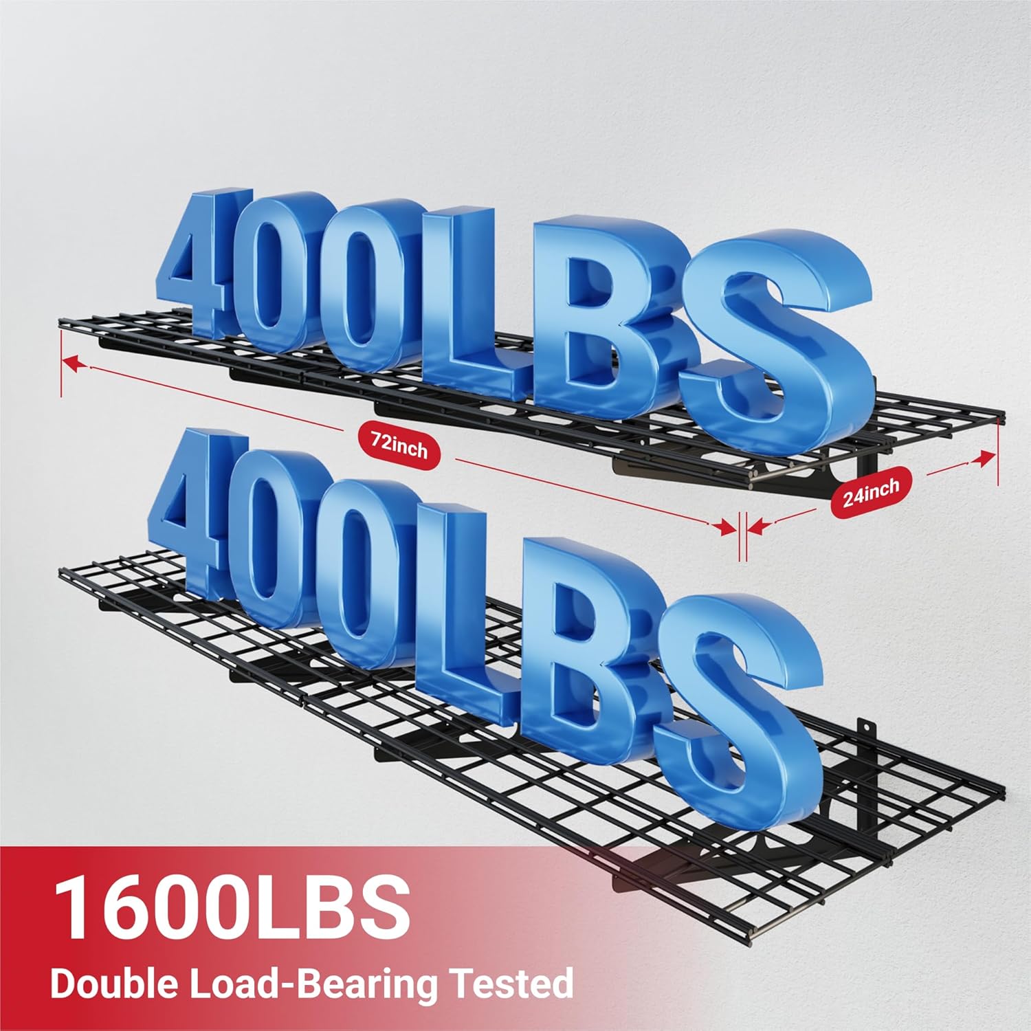 FLEXIMOUNTS 2-Pack 2x6ft Garage Shelving with Hooks, 24-inch-by-72-inch Wall Shelf Garage Storage Racks Floating Shelves, Black