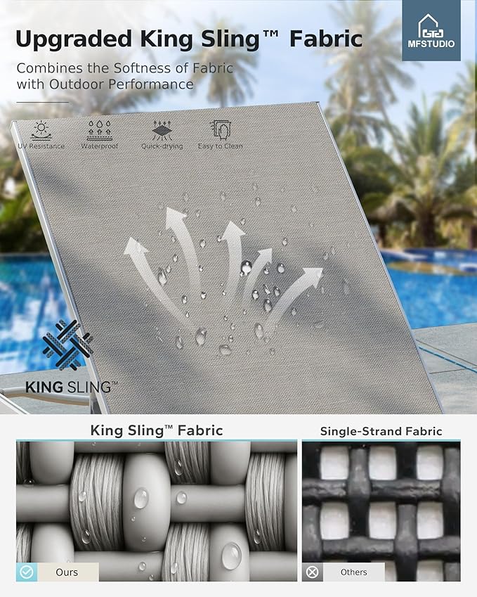 - Versatile & Maintain - MFSTUDIO patio lounge chaise is ideal for a variety of outdoor settings and easy to install. Low-maintenance Textilene fabric and rust-resistant frame lets outdoor lounge chaise all seasons available and easy to clean. Pls kindly wipe the water off and drain the water to prolong its service time