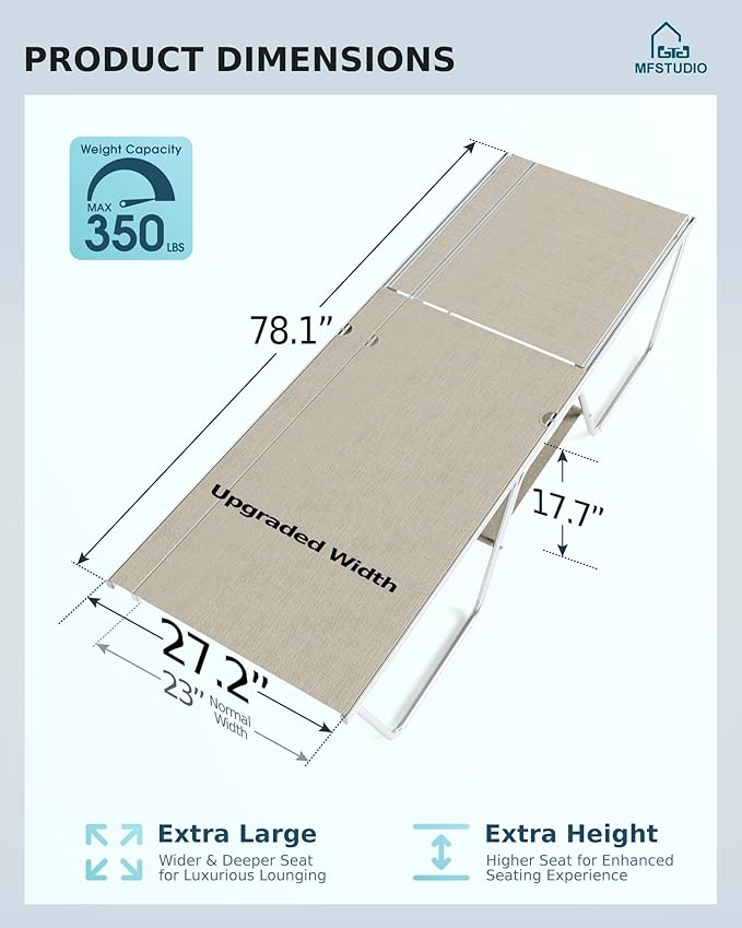 - Larger & Stable - Outdoor lounger chair is more wider and higher for enhancing seating experience. Unique W-shape frame and the large contact area of the four crossbars ensures the safety of each leisure posture and can support up to 350lbs