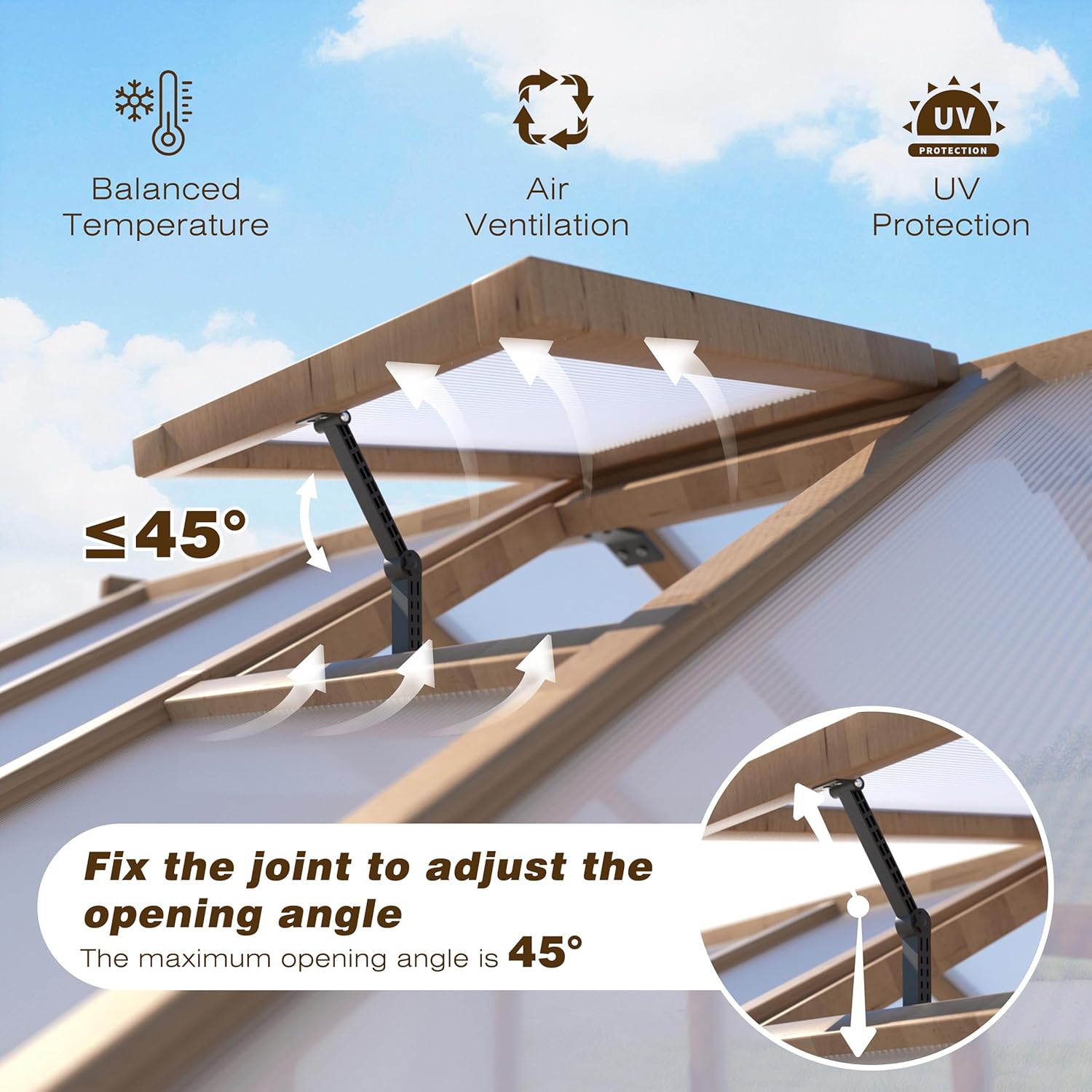 - 【Ventilated and Balanced Temperature】Provides fresh air to your plants via the window with adjustable opening angle. The bolts on the greenhouse frame kit sides could be used to fix the roofs and keep them open to provide a healthy ventilation system and balanced temperature for your plants in different seasons.