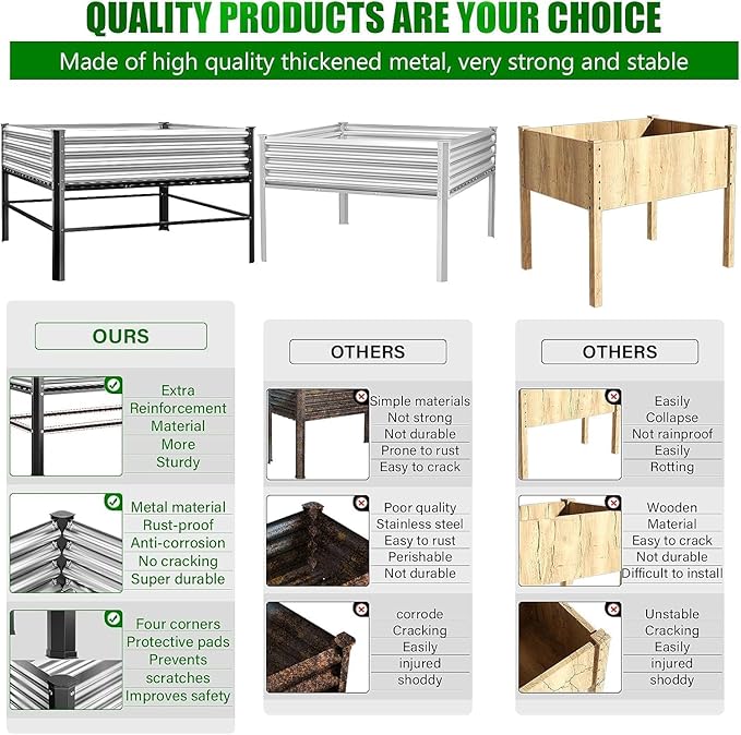 - 【Distinctive Design】-Outdoor elevated garden beds, our custom design style features galvanized sheet metal on the top, a stainless steel frame on the middle base, and the lower four corners are made of heavy-duty steel with a black powder-coated finish,This combination exceeds the lifespan of wooden products and ensures excellent rust resistance to keep the garden bed in the best condition for a long time.